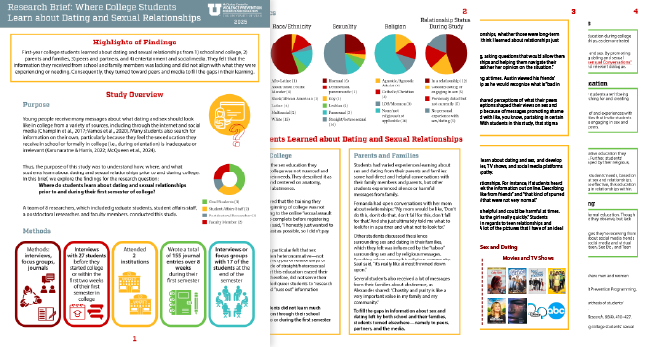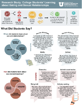 A group of faculty and student researchers at the University of Utah explored how and where first-year college students learned about dating and sexual relationships. You can view a short infographic summarizing study findings and read their research brief about where college students learned about dating and sex. What did they find?