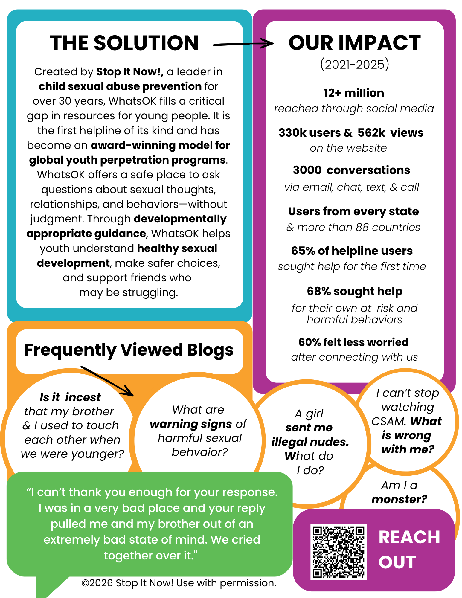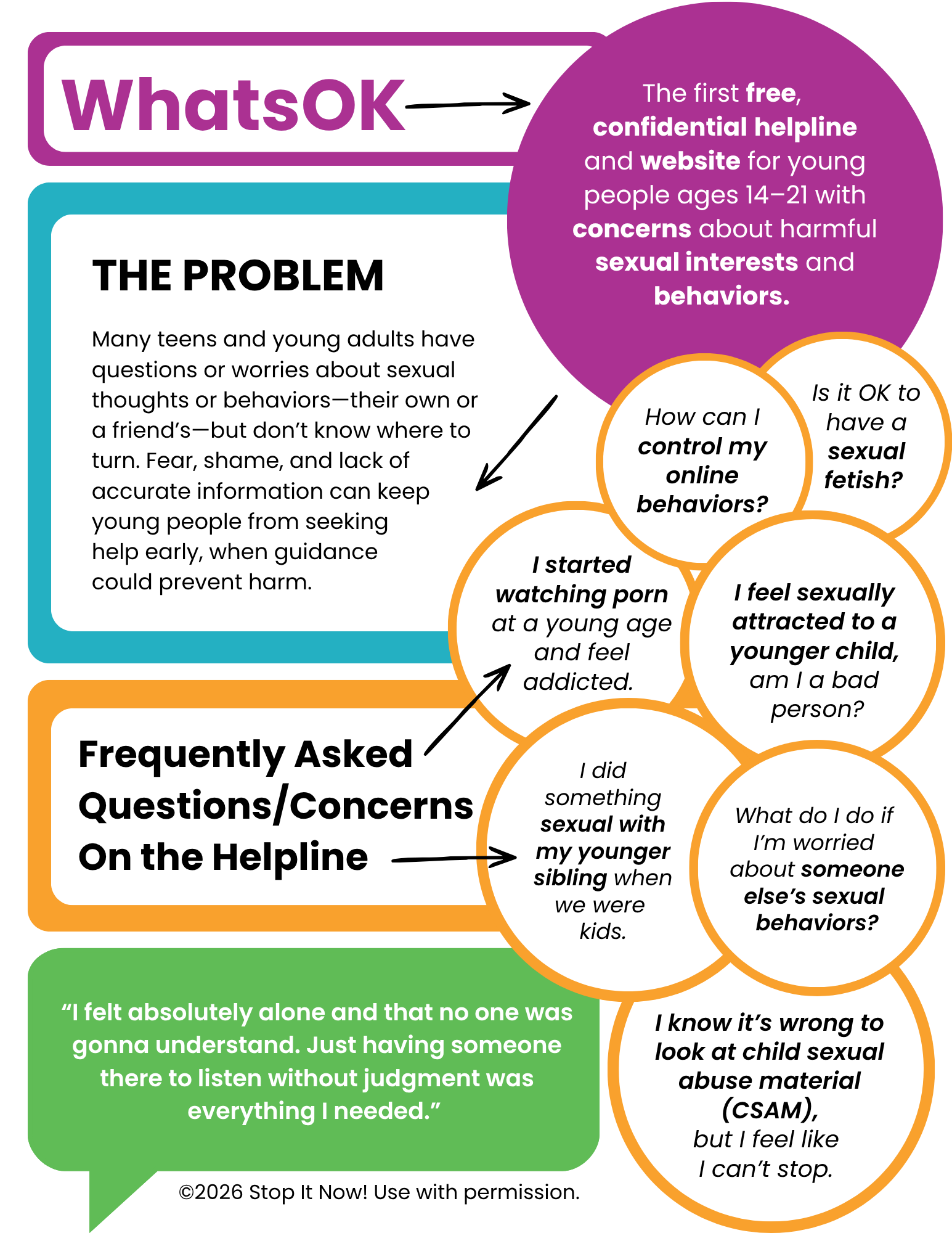 In 2021, Stop It Now! developed and piloted a groundbreaking and unique new resource for young people with the goal of deterring sexually harmful behaviors. WhatsOK is a website (whatsok.org) and a helpline (whatsok.org/ask) that offers free, confidential support and resources to youth and young adults (ages 14-21) with concerns about their own or a friend’s sexual thoughts, feelings, and behaviors.
